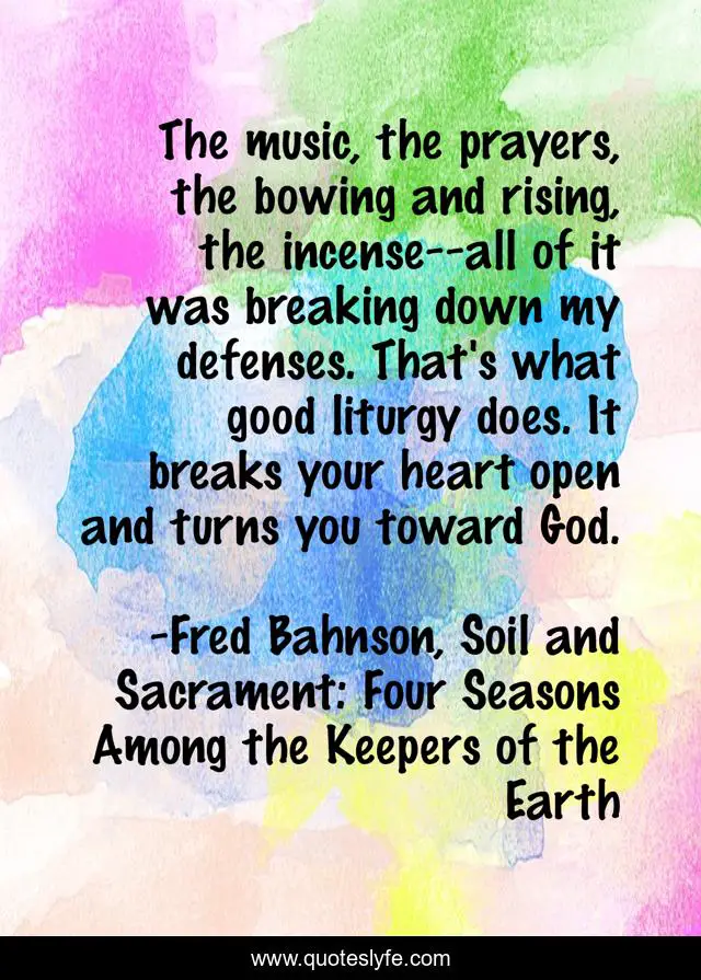 This page presents the quote "The music, the prayers, the bowing and rising, the incense--all of it was breaking down my defenses. That's what good liturgy does. It breaks your heart open and turns you toward God.". Author of this quote is Fred Bahnson, Soil and Sacrament: Four Seasons Among the Keepers of the Earth. This quote is about liturgy, music, prayer,.