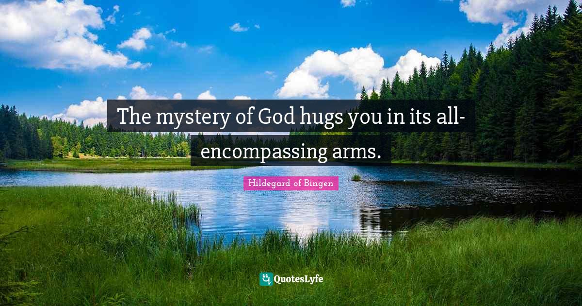 This page presents the quote "The mystery of God hugs you in its all-encompassing arms.". Author of this quote is Hildegard of Bingen. This quote is about mystery of god, hug, arms, mystery,.