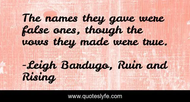 This page presents the quote "The names they gave were false ones, though the vows they made were true.". Author of this quote is Leigh Bardugo, Ruin and Rising. This quote is about falsehood, love, unity, marriage, truth, affection,.