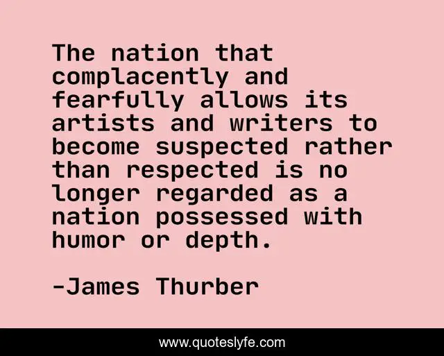 This page presents the quote "The nation that complacently and fearfully allows its artists and writers to become suspected rather than respected is no longer regarded as a nation possessed with humor or depth.". Author of this quote is James Thurber. This quote is about become, nation, artists,.