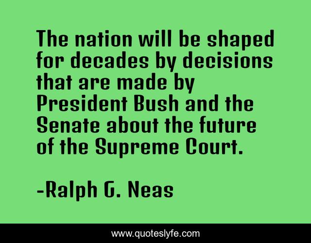 This page presents the quote "The nation will be shaped for decades by decisions that are made by President Bush and the Senate about the future of the Supreme Court.". Author of this quote is Ralph G. Neas. This quote is about president, decisions, nation,.