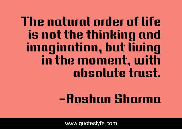 This page presents the quote "The natural order of life is not the thinking and imagination, but living in the moment, with absolute trust.". Author of this quote is Roshan Sharma. This quote is about knowledge, philosophy, imagination, truth, trust, awareness,.