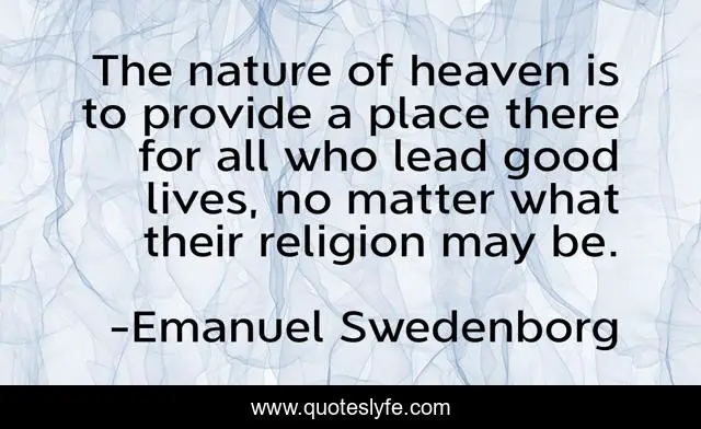 This page presents the quote "The nature of heaven is to provide a place there for all who lead good lives, no matter what their religion may be.". Author of this quote is Emanuel Swedenborg. This quote is about heaven, inclusion, afterlife, swedenborg, nature, religion,.