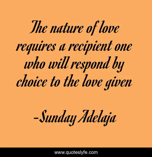 This page presents the quote "The nature of love requires a recipient one who will respond by choice to the love given". Author of this quote is Sunday Adelaja. This quote is about nature-of-love, given, love, nature-of-man, choice, recipient, response, affection,.