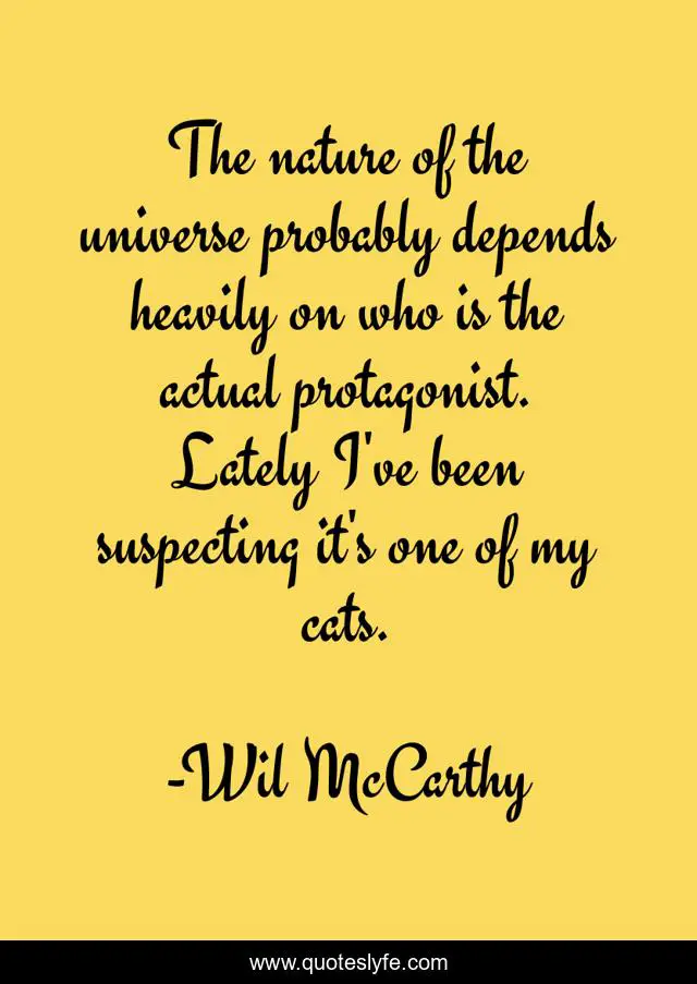 This page presents the quote "The nature of the universe probably depends heavily on who is the actual protagonist. Lately I've been suspecting it's one of my cats.". Author of this quote is Wil McCarthy. This quote is about nature-of-things, cats, point-of-view, universe, protagonists,.