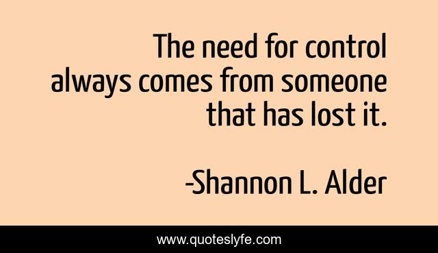This page presents the quote "The need for control always comes from someone that has lost it.". Author of this quote is Shannon L. Alder. This quote is about control, anxiety, out-of-control, abandonment-issues, manipulative, controlling, fear, loss-of-control,.