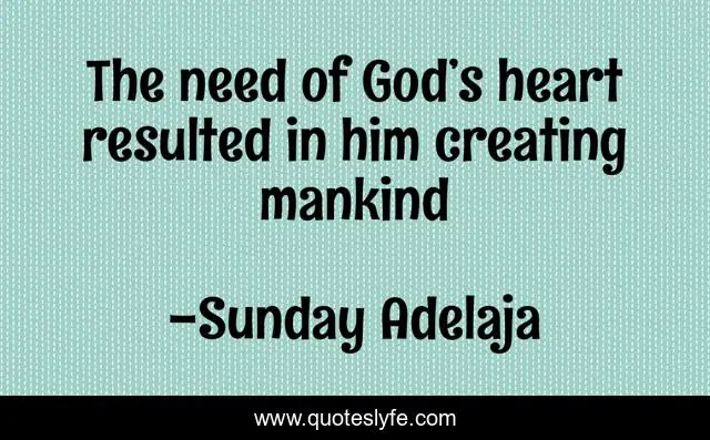 This page presents the quote "The need of God’s heart resulted in him creating mankind". Author of this quote is Sunday Adelaja. This quote is about need, heart-desire, creation, mankind, hunger-for-success,.