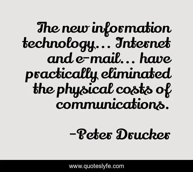This page presents the quote "The new information technology... Internet and e-mail... have practically eliminated the physical costs of communications.". Author of this quote is Peter Drucker. This quote is about technology, internet,.