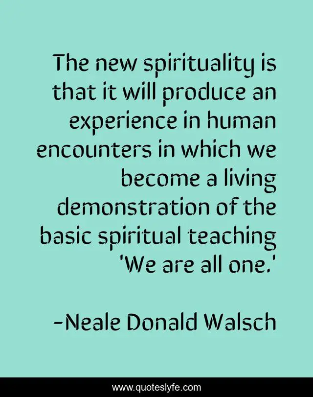 This page presents the quote "The new spirituality is that it will produce an experience in human encounters in which we become a living demonstration of the basic spiritual teaching 'We are all one.'". Author of this quote is Neale Donald Walsch. This quote is about living, spiritual, human,.