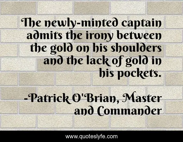 This page presents the quote "The newly-minted captain admits the irony between the gold on his shoulders and the lack of gold in his pockets.". Author of this quote is Patrick O'Brian, Master and Commander. This quote is about prestige, influence, materialism,.
