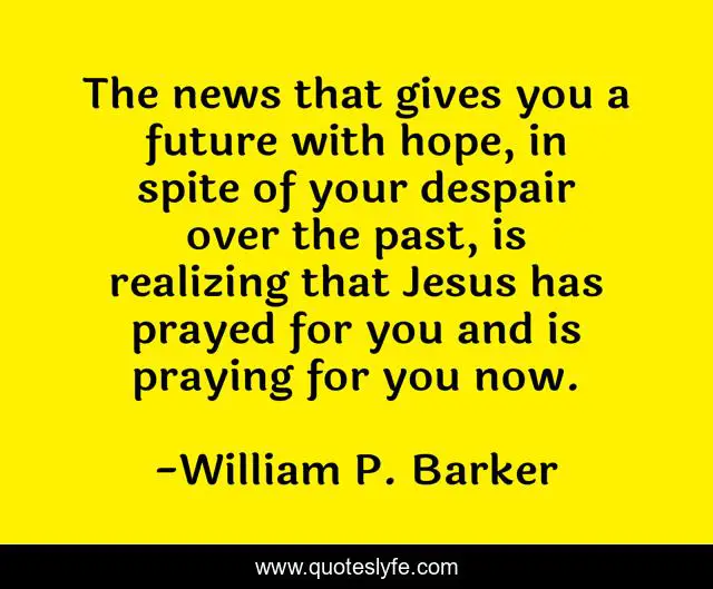 This page presents the quote "The news that gives you a future with hope, in spite of your despair over the past, is realizing that Jesus has prayed for you and is praying for you now.". Author of this quote is William P. Barker. This quote is about jesus-christ, despair, hope,.