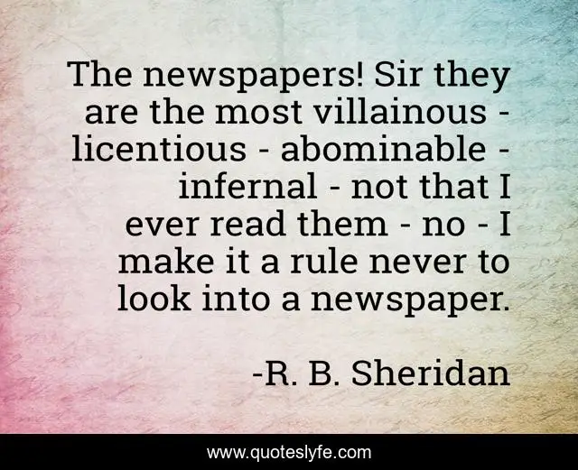 This page presents the quote "The newspapers! Sir they are the most villainous - licentious - abominable - infernal - not that I ever read them - no - I make it a rule never to look into a newspaper.". Author of this quote is R. B. Sheridan. .
