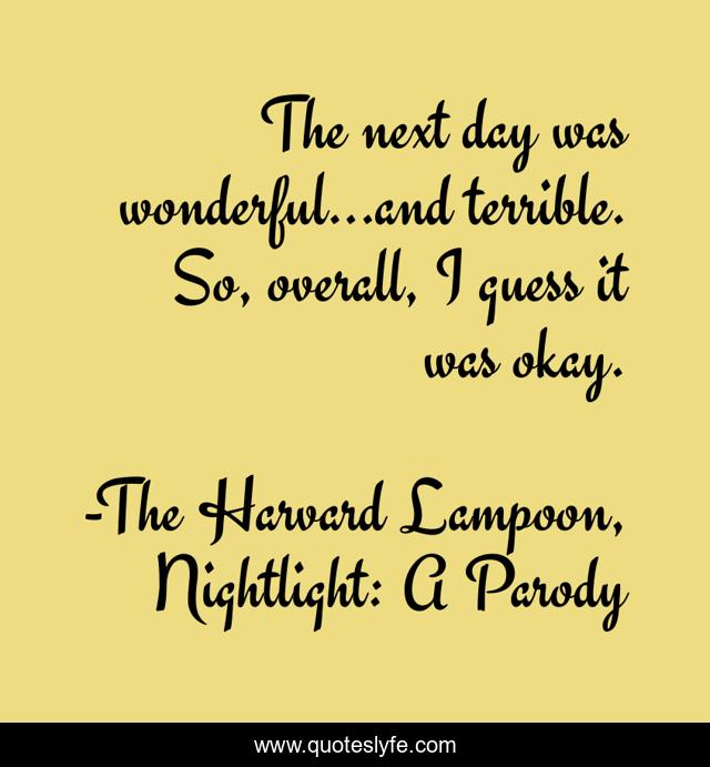 This page presents the quote "The next day was wonderful...and terrible. So, overall, I guess it was okay.". Author of this quote is The Harvard Lampoon, Nightlight: A Parody. .