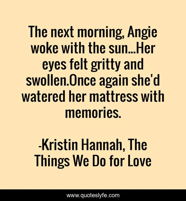 "Kristin Hannah, The Things We Do for Love Quotes." Quoteslyfe.com, 2025. Sat. 06 Dec. 2025. <https://www.quoteslyfe.com/quote/The-next-morning-Angie-woke-with-the-175592>.