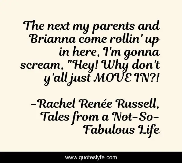 This page presents the quote "The next my parents and Brianna come rollin' up in here, I'm gonna scream, "Hey! Why don't y'all just MOVE IN?!". Author of this quote is Rachel Renée Russell, Tales from a Not-So-Fabulous Life. This quote is about humor, parents, teenagers,.