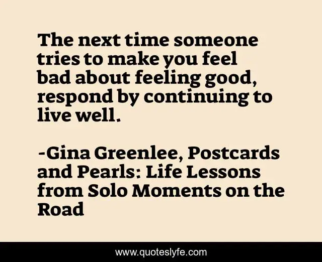 This page presents the quote "The next time someone tries to make you feel bad about feeling good, respond by continuing to live well.". Author of this quote is Gina Greenlee, Postcards and Pearls: Life Lessons from Solo Moments on the Road. This quote is about feeling-good, inspire, feeling-alive, living-well, live-well, inspirational-attitude, positive-psychology, feeling-good-about-yourself, inspirational,.