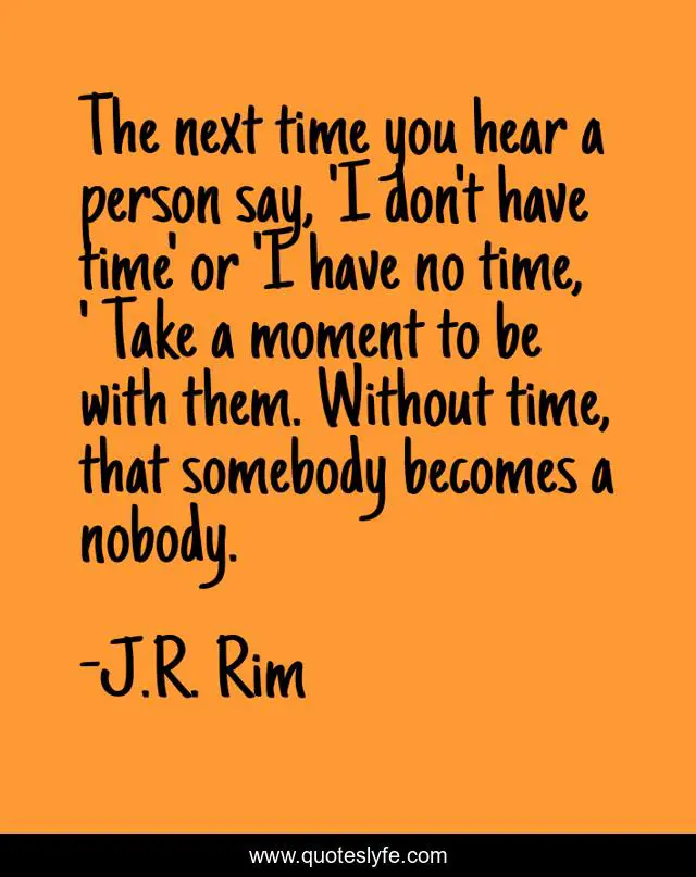 This page presents the quote "The next time you hear a person say, 'I don't have time' or 'I have no time, ' Take a moment to be with them. Without time, that somebody becomes a nobody.". Author of this quote is J.R. Rim. This quote is about death, be-with-somebody, nobody, no-time, dead, moment, life-lessons, time, no-time-for-life,.