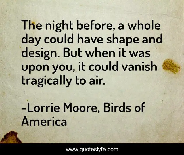 This page presents the quote "The night before, a whole day could have shape and design. But when it was upon you, it could vanish tragically to air.". Author of this quote is Lorrie Moore, Birds of America. .