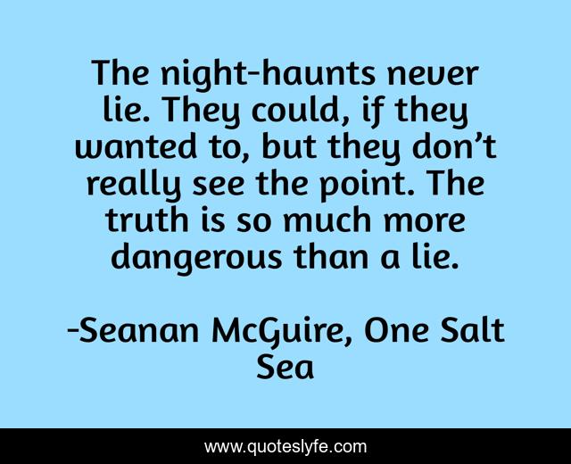 This page presents the quote "The night-haunts never lie. They could, if they wanted to, but they don’t really see the point. The truth is so much more dangerous than a lie.". Author of this quote is Seanan McGuire, One Salt Sea. This quote is about lies, october-daye, truth,.