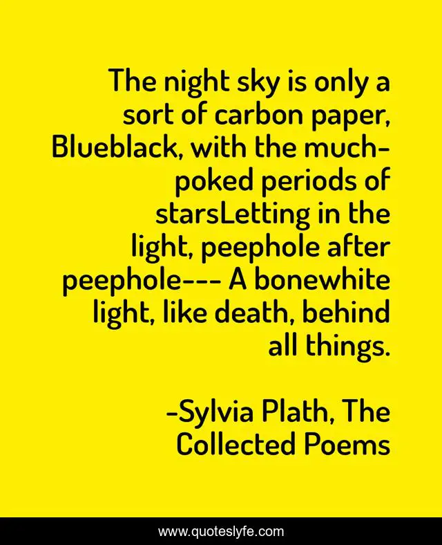 This page presents the quote "The night sky is only a sort of carbon paper, Blueblack, with the much-poked periods of starsLetting in the light, peephole after peephole--- A bonewhite light, like death, behind all things.". Author of this quote is Sylvia Plath, The Collected Poems. This quote is about light, death, poetry, stars, night,.