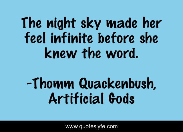 This page presents the quote "The night sky made her feel infinite before she knew the word.". Author of this quote is Thomm Quackenbush, Artificial Gods. This quote is about infinite, sky, night,.