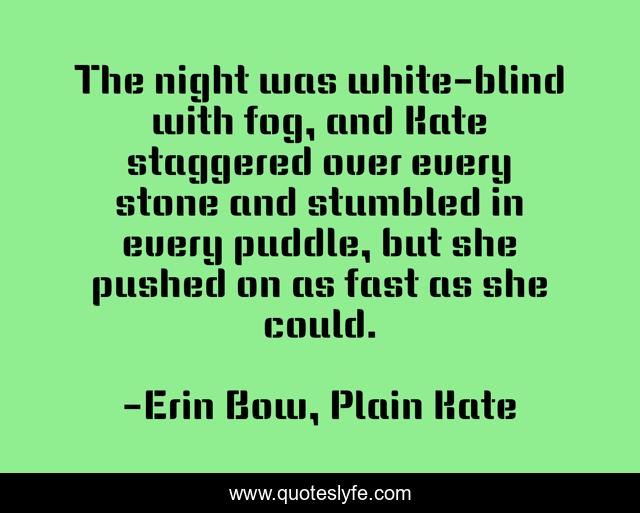 This page presents the quote "The night was white-blind with fog, and Kate staggered over every stone and stumbled in every puddle, but she pushed on as fast as she could.". Author of this quote is Erin Bow, Plain Kate. This quote is about hurrying, fog, determination, night, fatigue, message, mist,.