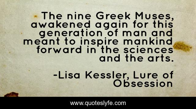 This page presents the quote "The nine Greek Muses, awakened again for this generation of man and meant to inspire mankind forward in the sciences and the arts.". Author of this quote is Lisa Kessler, Lure of Obsession. This quote is about muses, zeus, kronos, mythology, paranormal-romance, titans,.
