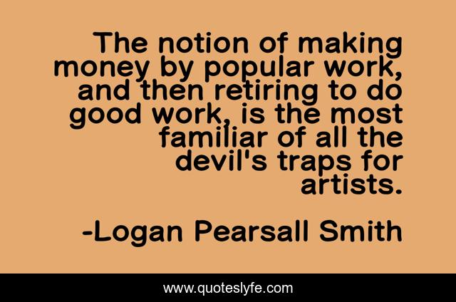 This page presents the quote "The notion of making money by popular work, and then retiring to do good work, is the most familiar of all the devil's traps for artists.". Author of this quote is Logan Pearsall Smith. This quote is about art, artists,.