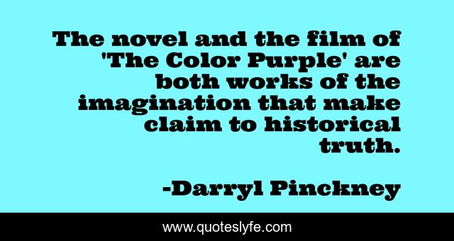 This page presents the quote "The novel and the film of 'The Color Purple' are both works of the imagination that make claim to historical truth.". Author of this quote is Darryl Pinckney. This quote is about color, purple, truth,.