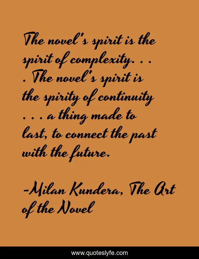 This page presents the quote "The novel's spirit is the spirit of complexity. . . . The novel's spirit is the spirity of continuity . . . a thing made to last, to connect the past with the future.". Author of this quote is Milan Kundera, The Art of the Novel. .