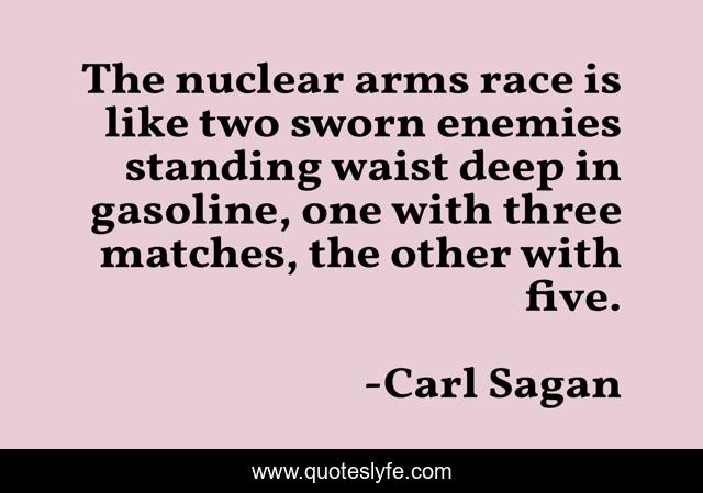 This page presents the quote "The nuclear arms race is like two sworn enemies standing waist deep in gasoline, one with three matches, the other with five.". Author of this quote is Carl Sagan. This quote is about absurdity, reason, humor, war, sagan,.