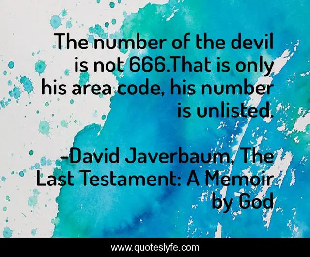 This page presents the quote "The number of the devil is not 666.That is only his area code, his number is unlisted.". Author of this quote is David Javerbaum, The Last Testament: A Memoir by God. .