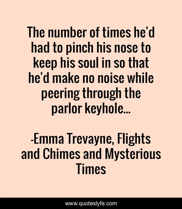 This page presents the quote "The number of times he'd had to pinch his nose to keep his soul in so that he'd make no noise while peering through the parlor keyhole...". Author of this quote is Emma Trevayne, Flights and Chimes and Mysterious Times. This quote is about funny, comedy,.