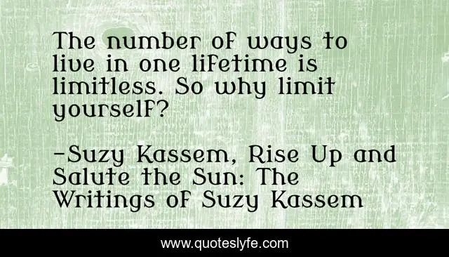 This page presents the quote "The number of ways to live in one lifetime is limitless. So why limit yourself?". Author of this quote is Suzy Kassem, Rise Up and Salute the Sun: The Writings of Suzy Kassem. This quote is about achievements, life, success, limits, universe, fears, sky, behaviour, attitude,.