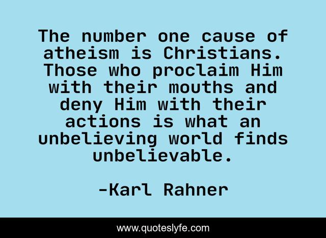 This page presents the quote "The number one cause of atheism is Christians. Those who proclaim Him with their mouths and deny Him with their actions is what an unbelieving world finds unbelievable.". Author of this quote is Karl Rahner. .