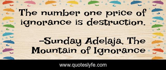 This page presents the quote "The number one price of ignorance is destruction.". Author of this quote is Sunday Adelaja, The Mountain of Ignorance. This quote is about mountain, life, darkness, power, danger, god, price, people, ignorance,.