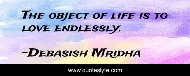 This page presents the quote "The object of life is to love endlessly.". Author of this quote is Debasish Mridha. This quote is about love, philosophy, debasish-mridha, quotes, object-of-life, love-endlessly, debasish-mridha-md, inspirational, enthusiasm,.