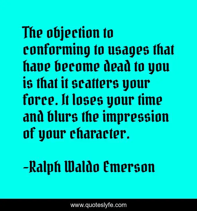 This page presents the quote "The objection to conforming to usages that have become dead to you is that it scatters your force. It loses your time and blurs the impression of your character.". Author of this quote is Ralph Waldo Emerson. This quote is about character, conformity, soul, independence,.