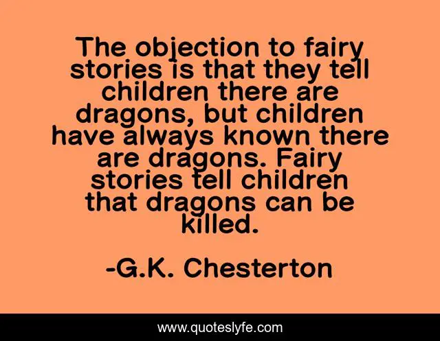 This page presents the quote "The objection to fairy stories is that they tell children there are dragons, but children have always known there are dragons. Fairy stories tell children that dragons can be killed.". Author of this quote is G.K. Chesterton. This quote is about fairytales, book-banning, book-objections, children, dragons,.