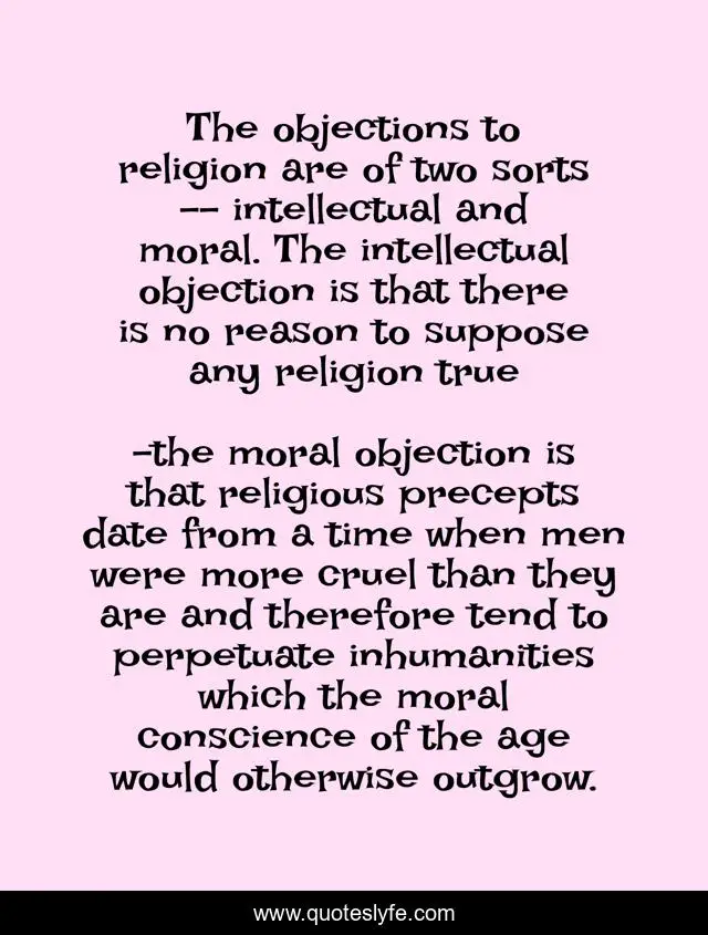 "the moral objection is that religious precepts date from a time when men were more cruel than they are and therefore tend to perpetuate inhumanities which the moral conscience of the age would otherwise outgrow. Quotes." Quoteslyfe.com, 2025. Sat. 06 Dec. 2025. <https://www.quoteslyfe.com/quote/The-objections-to-religion-are-of-two-164031>.