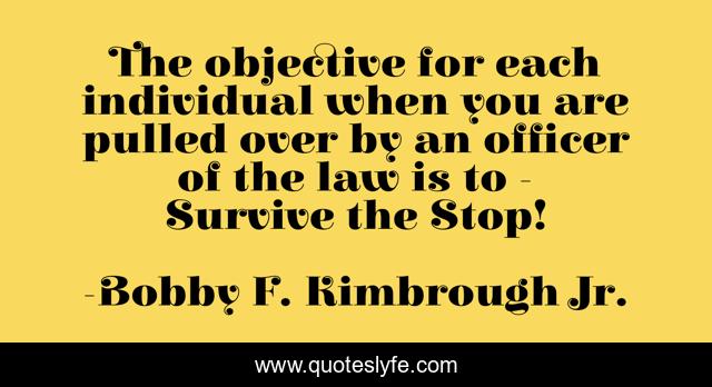 This page presents the quote "The objective for each individual when you are pulled over by an officer of the law is to - Survive the Stop!". Author of this quote is Bobby F. Kimbrough Jr.. This quote is about police-officers, law-enforcement, society, traffic-stops, community, cops, biases, respect, security,.