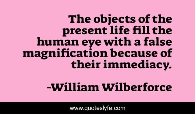 This page presents the quote "The objects of the present life fill the human eye with a false magnification because of their immediacy.". Author of this quote is William Wilberforce. This quote is about eternity, magnification, immediacy, inspirational, enthusiasm, materialism, present, vanity,.