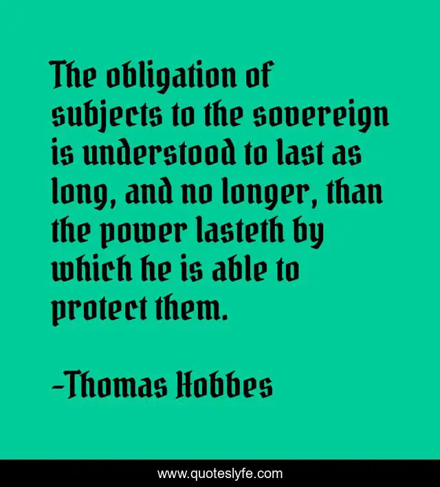 This page presents the quote "The obligation of subjects to the sovereign is understood to last as long, and no longer, than the power lasteth by which he is able to protect them.". Author of this quote is Thomas Hobbes. This quote is about protect, last, long,.