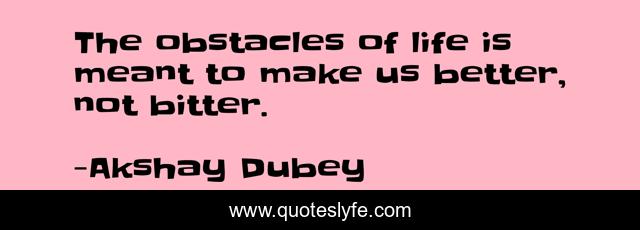 This page presents the quote "The obstacles of life is meant to make us better, not bitter.". Author of this quote is Akshay Dubey. This quote is about moivational, enthusiasm, inspirational, hurt,.