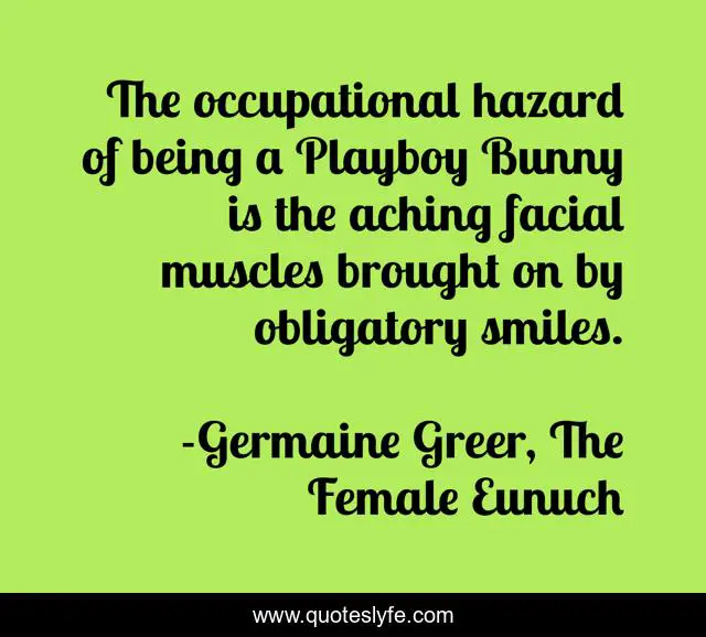 This page presents the quote "The occupational hazard of being a Playboy Bunny is the aching facial muscles brought on by obligatory smiles.". Author of this quote is Germaine Greer, The Female Eunuch. This quote is about sarcasm, playboy, feminism,.