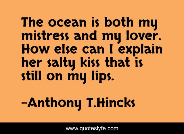 This page presents the quote "The ocean is both my mistress and my lover. How else can I explain her salty kiss that is still on my lips.". Author of this quote is Anthony T.Hincks. This quote is about life, love, kiss, philosophy, ocean, water, salky-kiss, sea, lover,.