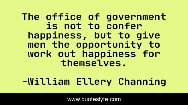 This page presents the quote "The office of government is not to confer happiness, but to give men the opportunity to work out happiness for themselves.". Author of this quote is William Ellery Channing. This quote is about work, government,.