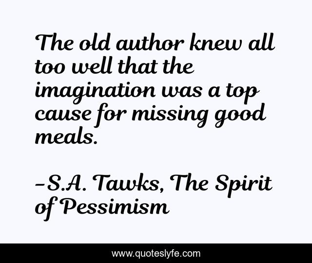 This page presents the quote "The old author knew all too well that the imagination was a top cause for missing good meals.". Author of this quote is S.A. Tawks, The Spirit of Pessimism. This quote is about imagination, breakfast, dinner, lunch,.