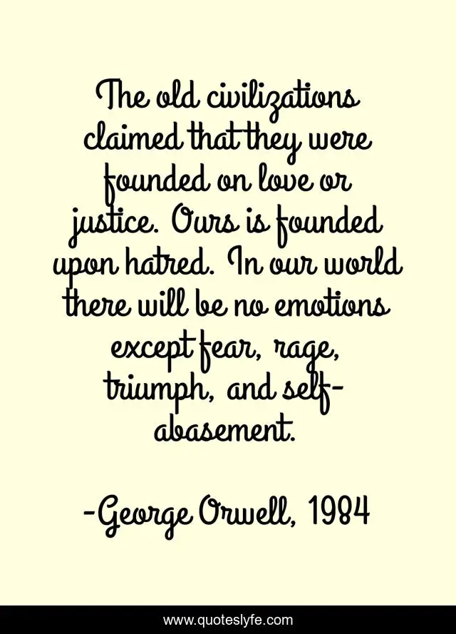 This page presents the quote "The old civilizations claimed that they were founded on love or justice. Ours is founded upon hatred. In our world there will be no emotions except fear, rage, triumph, and self-abasement.". Author of this quote is George Orwell, 1984. This quote is about fear, civilization, hatred, emotions,.
