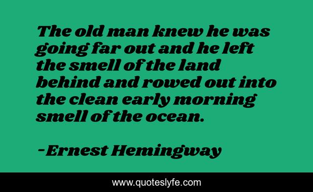 This page presents the quote "The old man knew he was going far out and he left the smell of the land behind and rowed out into the clean early morning smell of the ocean.". Author of this quote is Ernest Hemingway. This quote is about calmness, sea, ocean,.